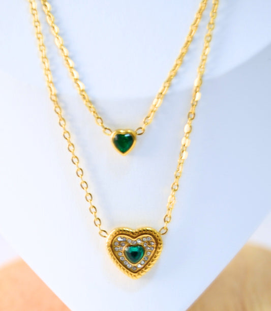 Forever Yours Gold Plated Layered Necklace with Green Heart Pendant