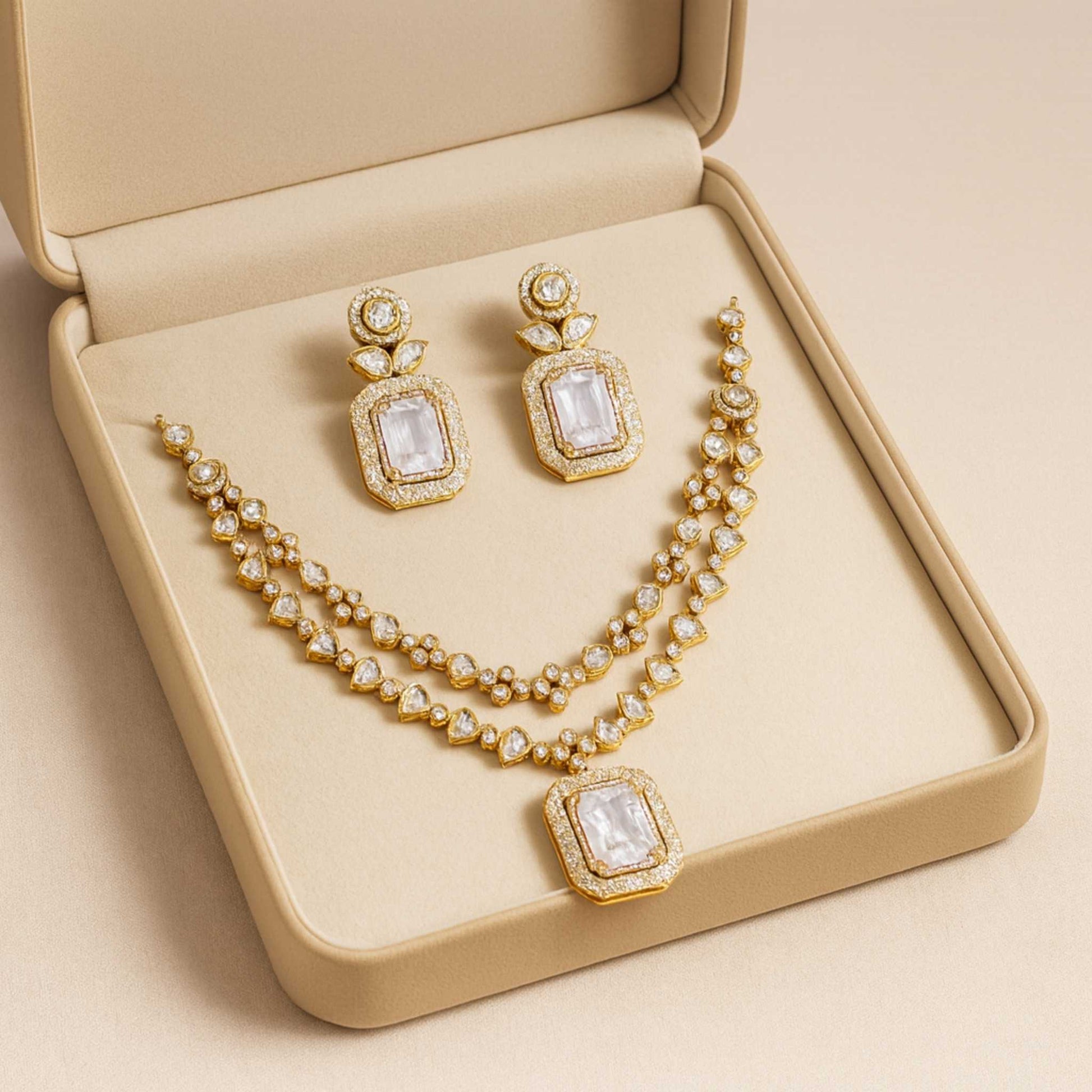 For a timeless and sophisticated look, this necklace set is the perfect finishing touch for any special event. With Kundan and Zirconia stones, it will elevate your elegance and add a touch of luxury to your ensemble.